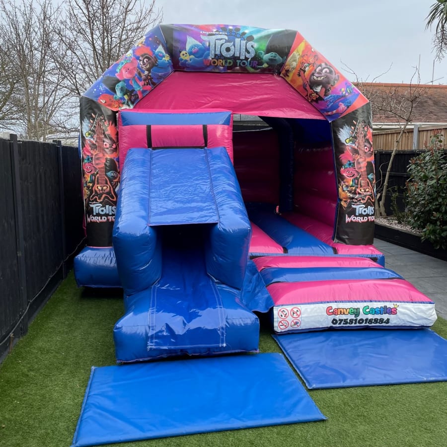 Transform your child's party into a magical adventure with our 12ft x 17ft Pink And Blue Trolls World Tour Combo Bouncy Castle. Specially designed to captivate and entertain, this vibrant bouncy castle is the perfect addition to any celebration, ensuring hours of fun and excitement for children of all ages.