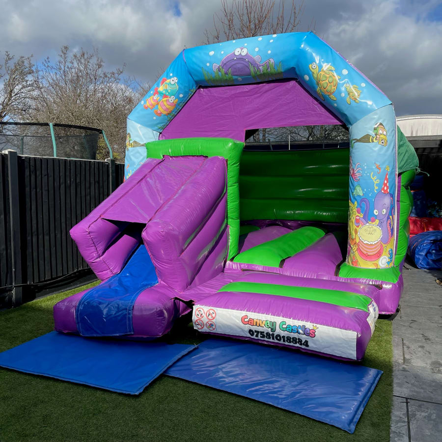 Dive into Fun with the 12ft x 17ft Green and Purple Under The Sea Slide Combo Bouncy Castle
