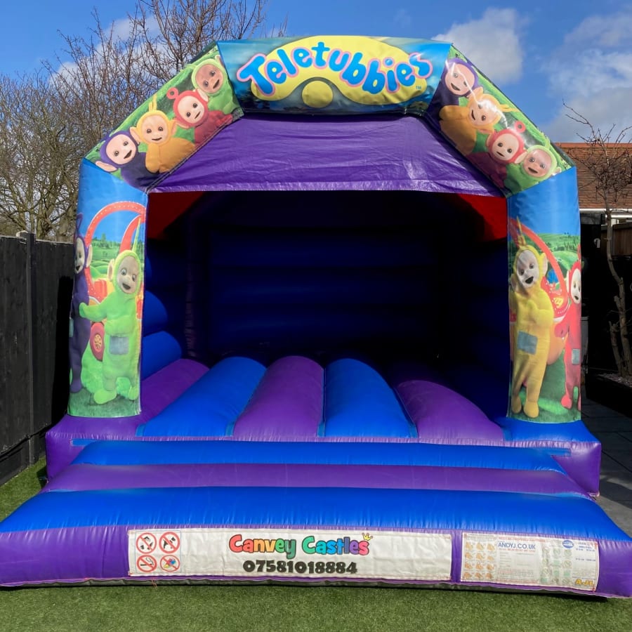 Blue and Purple Teletubbies Castle is available to hire across Essex, including Benfleet, Basildon & Southend, as well as all areas of our county.