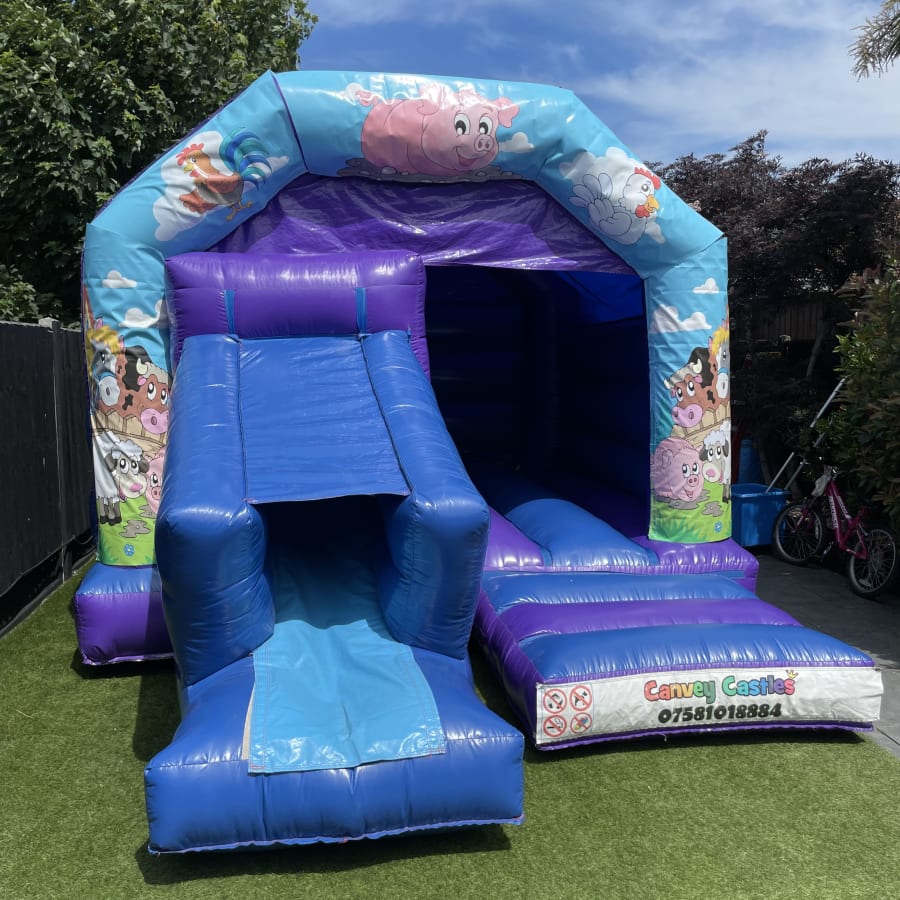 Don't miss out on the opportunity to elevate your event with our fantastic 12ft x 17ft Blue and Purple Farmland Slide Combo Bouncy Castle. Contact us today to learn more about our party rentals in Essex and secure your booking. Let us help you create unforgettable memories with a touch of bouncing fun!