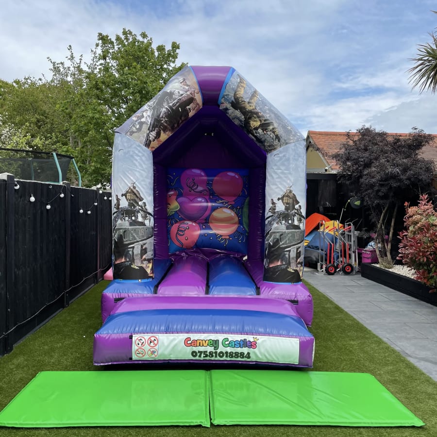 Transform your next event into an unforgettable experience with our stunning 8ft x 12ft Blue and Purple Call of Duty Warzone Bouncy Castle. Perfect for both children and adults, this vibrant bouncy castle provides endless entertainment and excitement at any gathering. Whether it's a birthday party, a school event, or a community fair, our Call of Duty Warzone-themed bouncy castle is sure to be a hit!