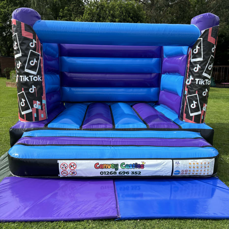 Don't miss out on the opportunity to enhance your event with the 12ft x 12ft Blue and Purple Tik Tok Low Height Bouncy Castle. Contact us today to reserve this popular attraction and ensure your party in Essex is one to remember. Let the fun begin!
