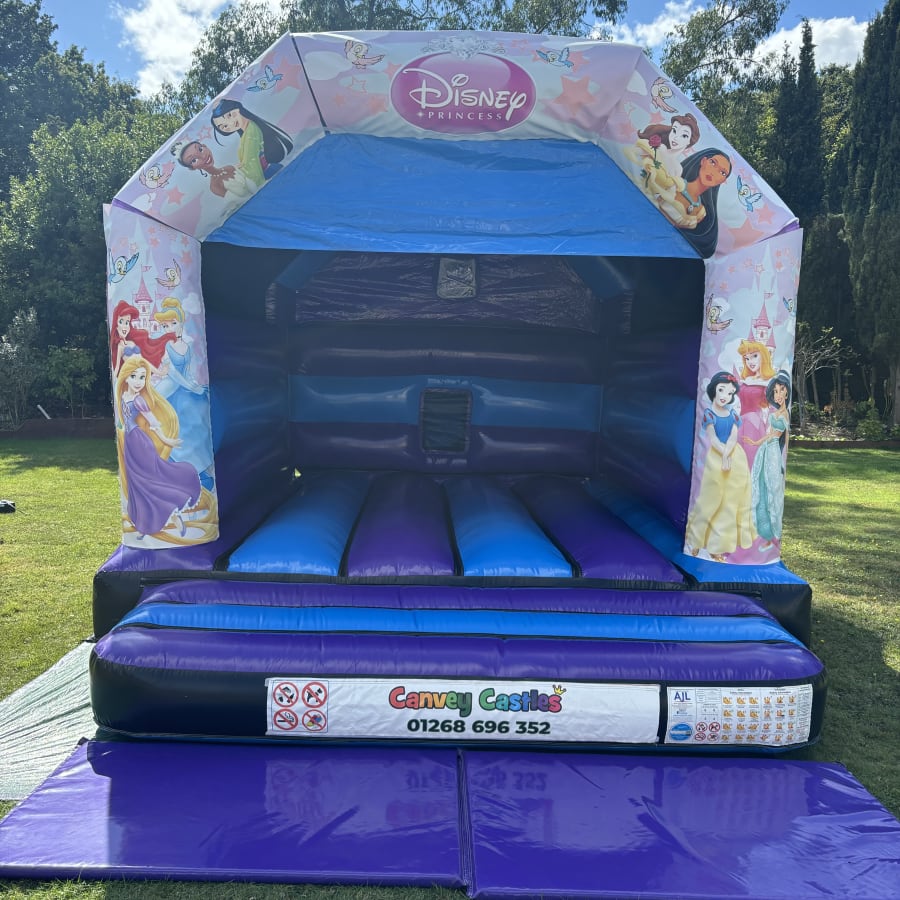 12ft x 15ft Purple and Blue Gloss Disney Princess Bouncy Castle Hire in Benfleet, Basildon, Brentwood, Chelmsford, Southend and all Essex Towns