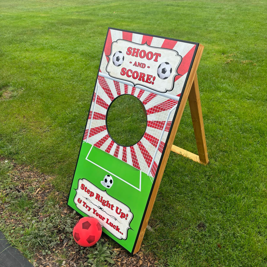 Our Football Shootout game offers an exciting challenge that will test your guests' skills and bring out their competitive spirit. Perfect for both children and adults, this game is designed to entertain all ages while promoting friendly competition. The game features a sturdy frame with a fabric target that includes multiple scoring zones, inviting players to aim and score as many points as possible.