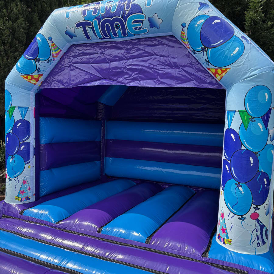 12ft x 12ft Light Blue and Purple Party Time Bouncy Castle in Southend, Brentwood, Chelmsford, and Essex