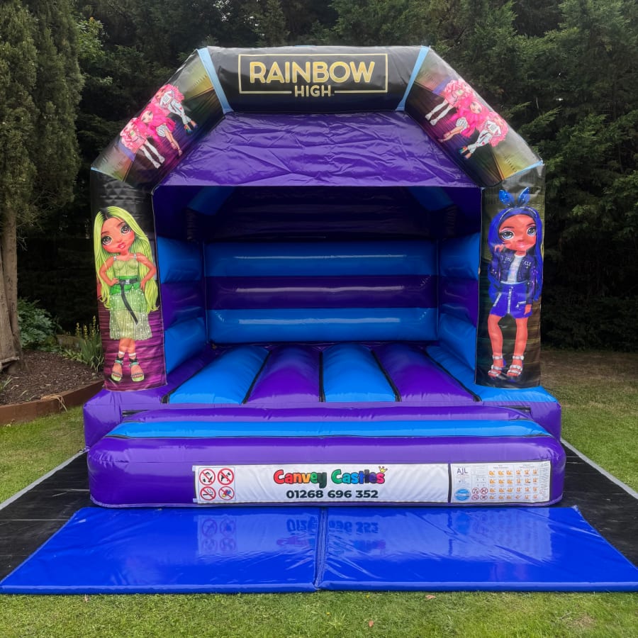 Make Your Event Unforgettable with Our 12ft x 12ft Light Blue and Purple Rainbow High Bouncy Castle