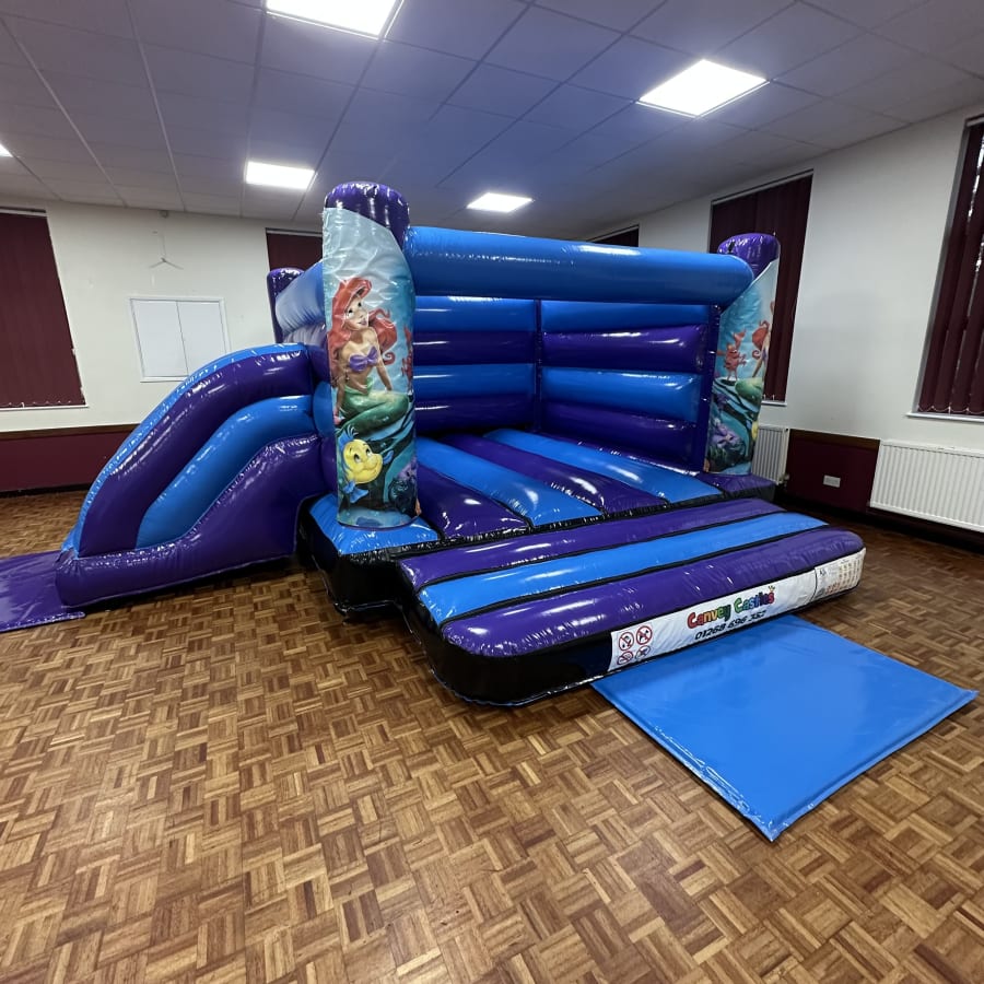The 16ft x 17ft Blue and Purple Little Mermaid Low Height Slide Combo Bouncy Castle is a vibrant, safe attraction for children's parties. Built with a low-height slide and enclosed bounce area, this mermaid-themed unit delivers fun without compromising safety. Ideal for garden parties, community events, and family gatherings, it adds instant colour and excitement to any celebration.