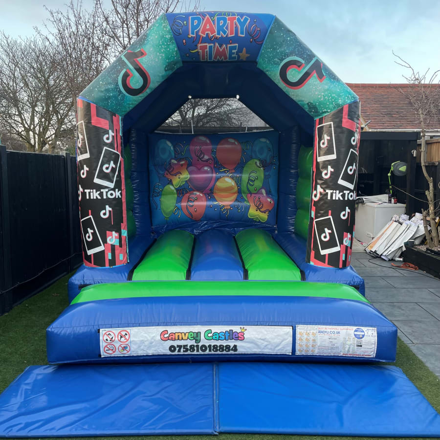 Make your party in Chelmsford, Southend, Brentwood, or Essex truly unforgettable with our 10ft x 12ft Green and Blue Tik Tok Bouncy Castle. Book now and let the bouncing fun begin!