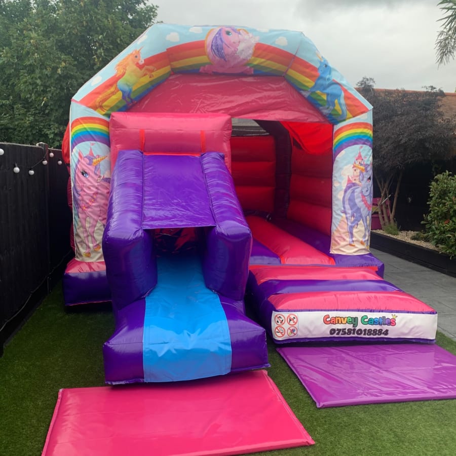 Magical Fun with Our 12ft x 17ft Pink and Purple Unicorn Slide Combo Bouncy Castle