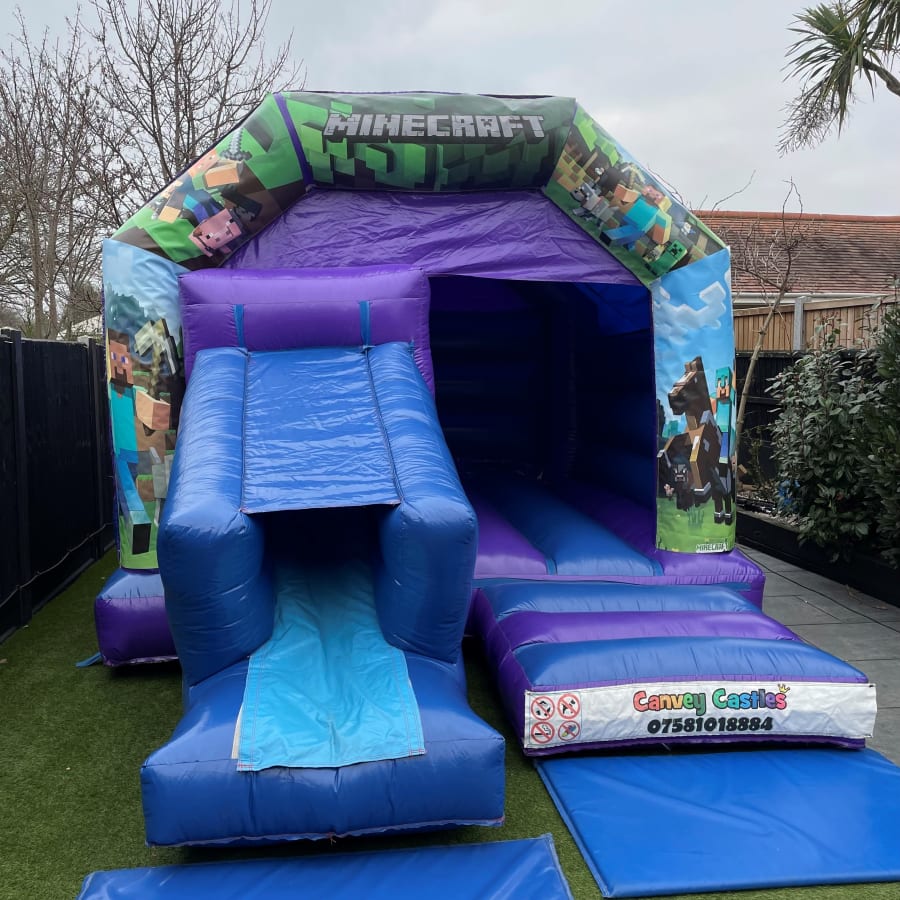 Experience the Ultimate Adventure with Our 12ft x 17ft Blue and Purple Minecraft Slide Combo Bouncy Castle in Essex