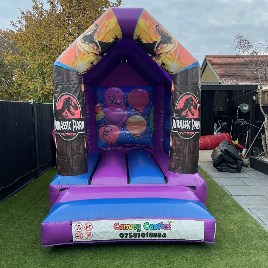 Book our 8ft x 12ft Blue and Purple Jurassic Park Bouncy Castle today for a party that will be the talk of the town!