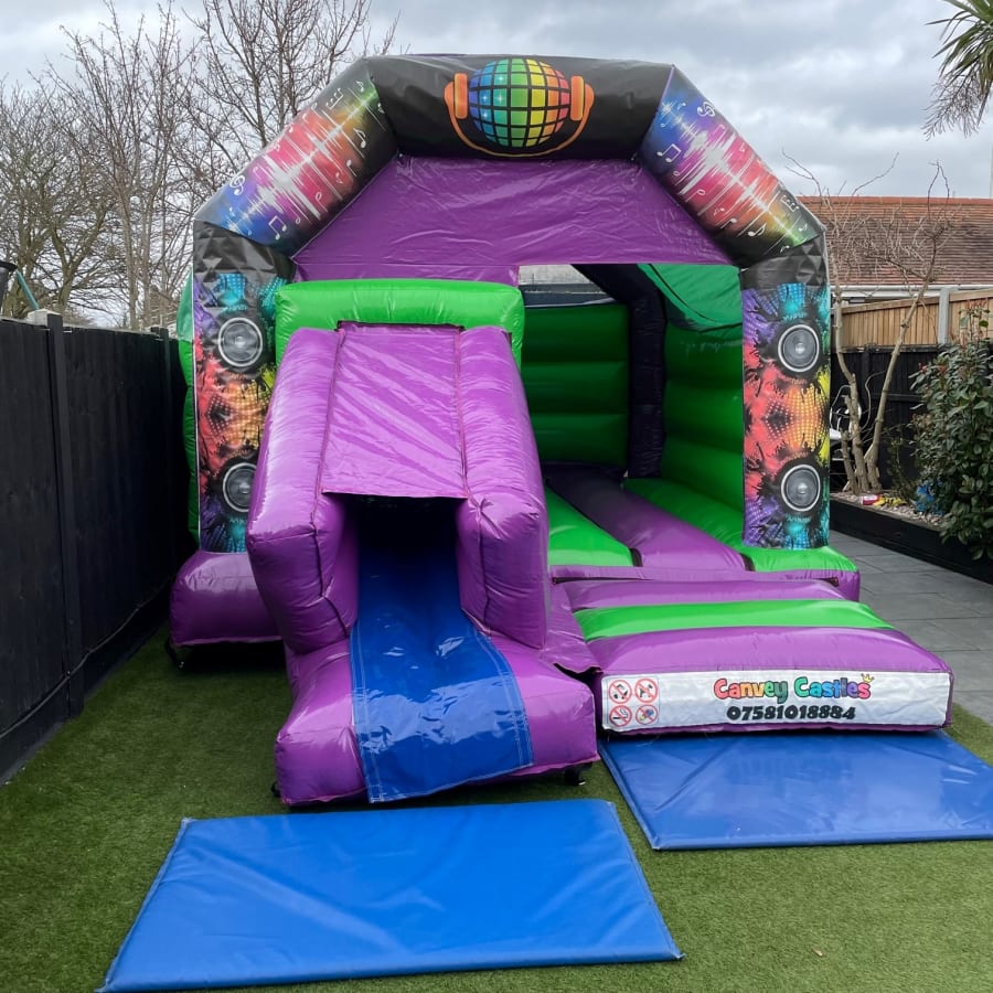 Don't miss out on the opportunity to make your event the talk of the town. Our party rentals essex 12ft x 17ft Green and Purple Disco Slide Combo Bouncy Castle in Essex is just a booking away. Contact us today to secure your rental and ensure that your event is filled with laughter, fun, and excitement. Let us help you create memories that will last a lifetime!