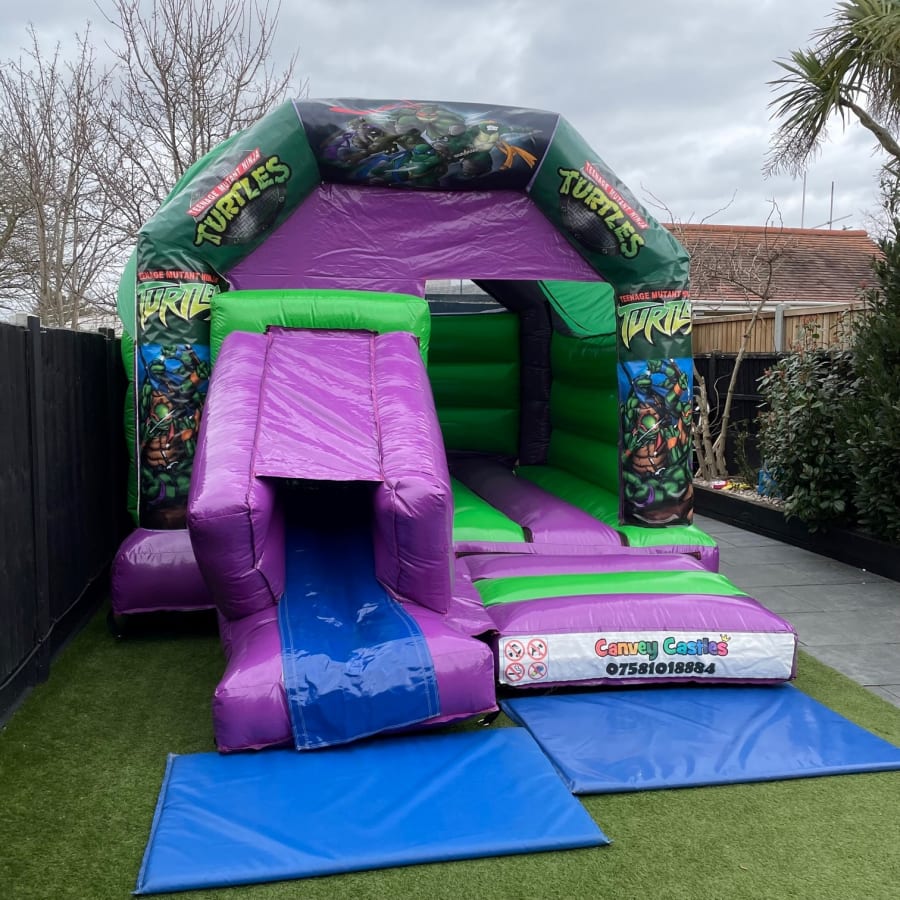 Unleash the Fun with the 12ft x 17ft Green and Purple Teenage Mutant Ninja Turtles Slide Combo Bouncy Castle