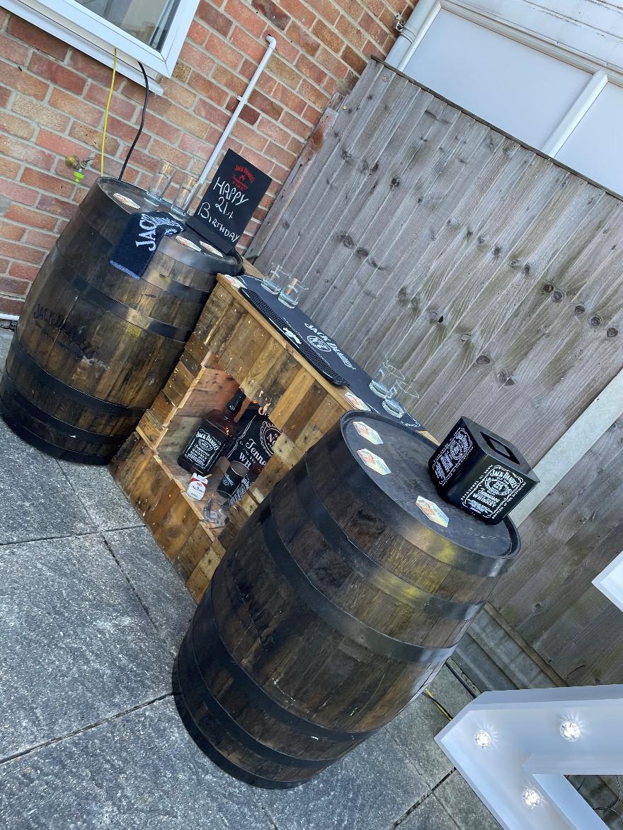 Looking to transform your special occasion into an unforgettable experience? Our Jack Daniels branded bar with authentic used whiskey barrels at either end is the ultimate centerpiece for any gathering. Perfect for parties, weddings, or corporate events, this unique bar combines rustic charm with a touch of sophistication, appealing to whiskey enthusiasts and event-goers alike.