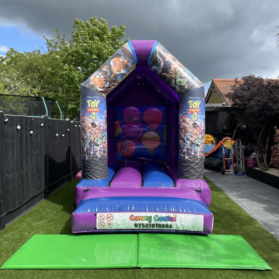 Unleash the Fun with the 8ft x 12ft Blue and Purple Toy Story 4 Bouncy Castle in Chelmsford, Brentwood, Southend, and Essex