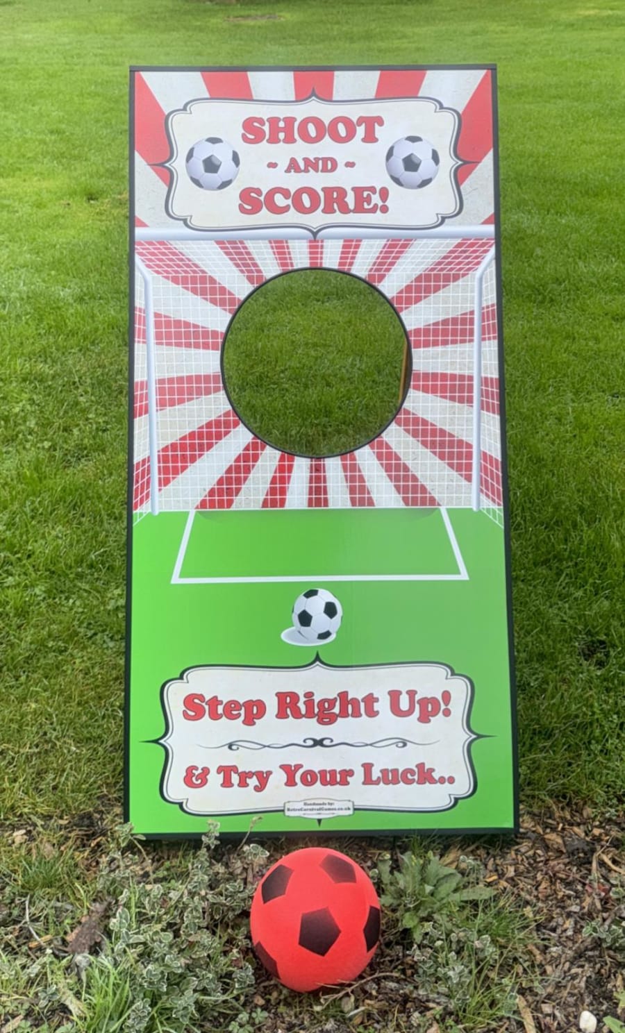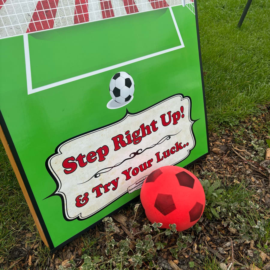Our Football Shootout game offers an exciting challenge that will test your guests' skills and bring out their competitive spirit. Perfect for both children and adults, this game is designed to entertain all ages while promoting friendly competition. The game features a sturdy frame with a fabric target that includes multiple scoring zones, inviting players to aim and score as many points as possible.