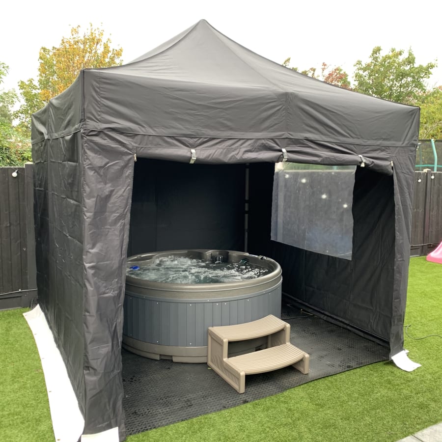 - 3m x 3m pro gazebo, black sidewalls and ground bar system with tie downs for securing safely.