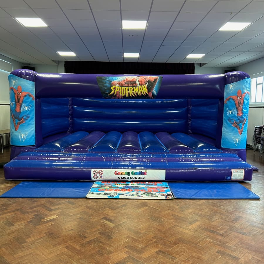 Unleash Spiderman Fun at Your Party with the 19ft x 18ft Blue and Purple Bouncy Castle (low height)