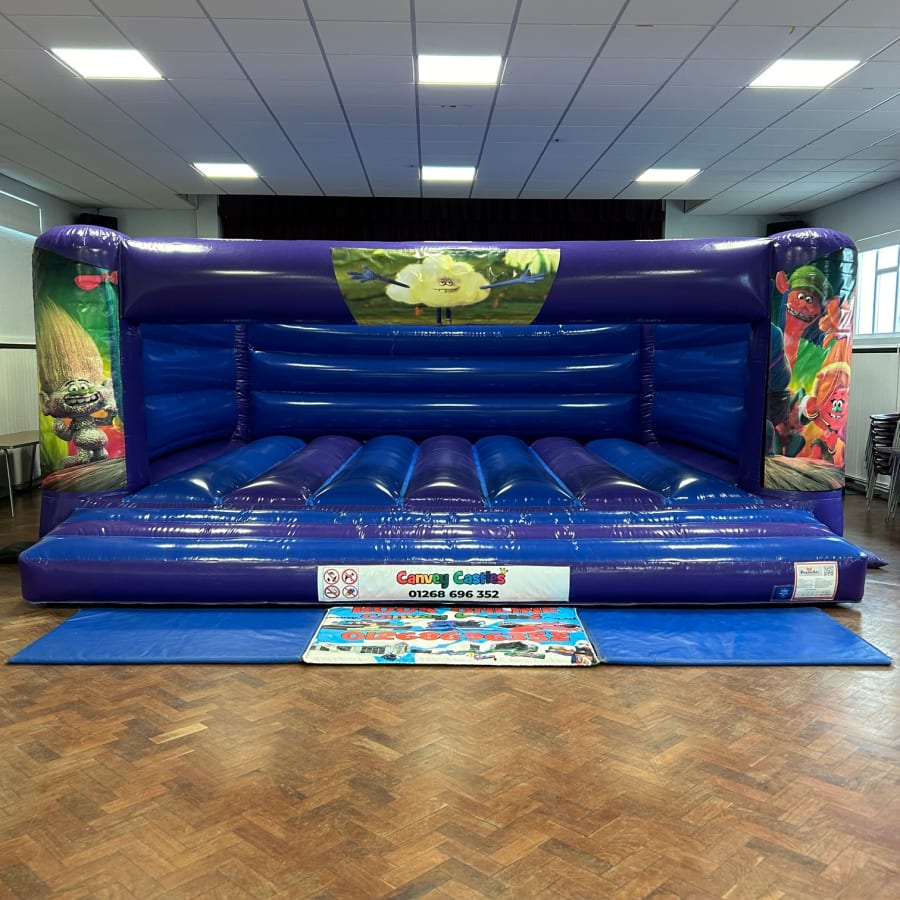 Exciting 19ft x 18ft Blue and Purple Trolls Bouncy Castle (low height) for Rent in Essex