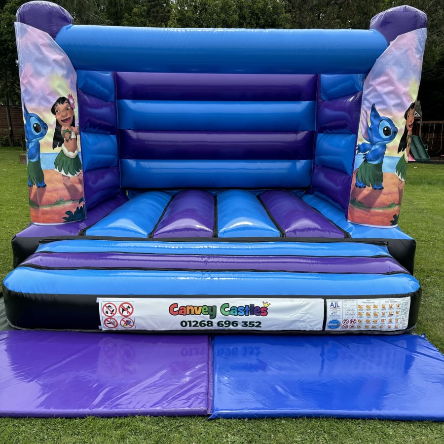 Make Your Event Unforgettable with Our 12ft x 12ft Blue and Purple Lilo and Stitch Low Height Bouncy Castle in Essex