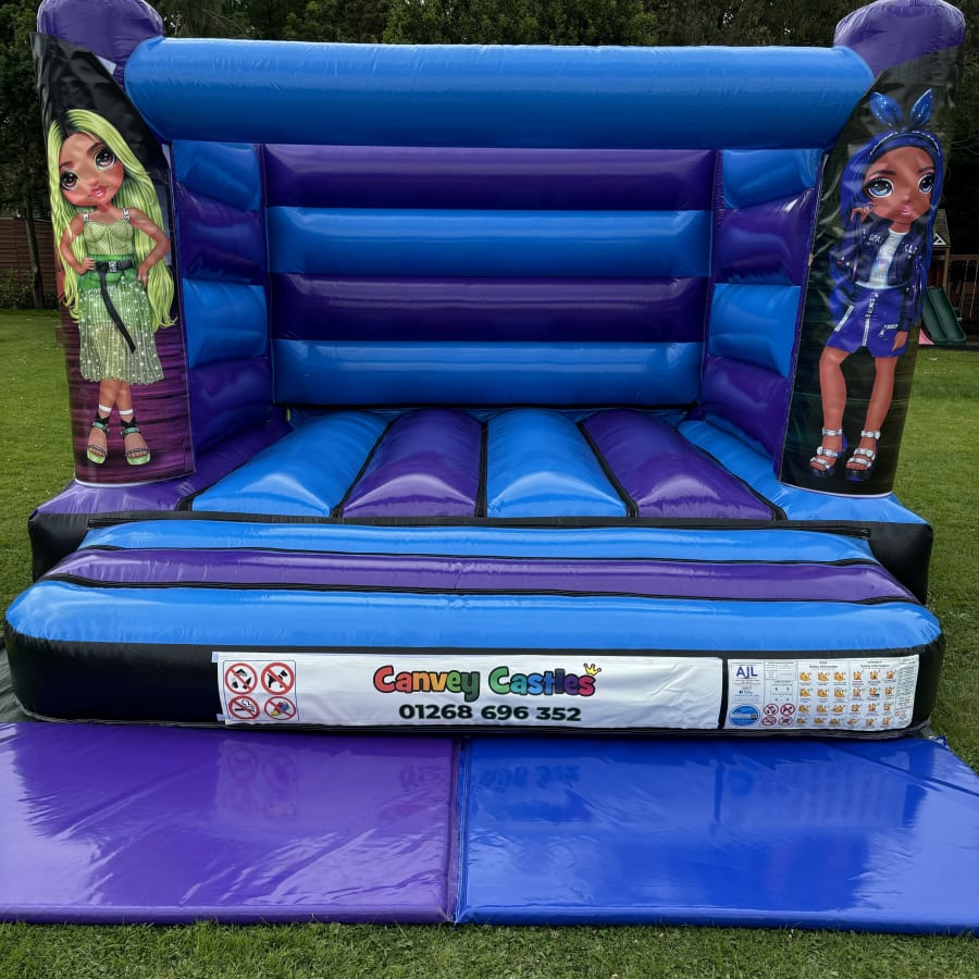 Unleash the Fun with Our 12ft x 12ft Blue and Purple Rainbow High Low Height Bouncy Castle