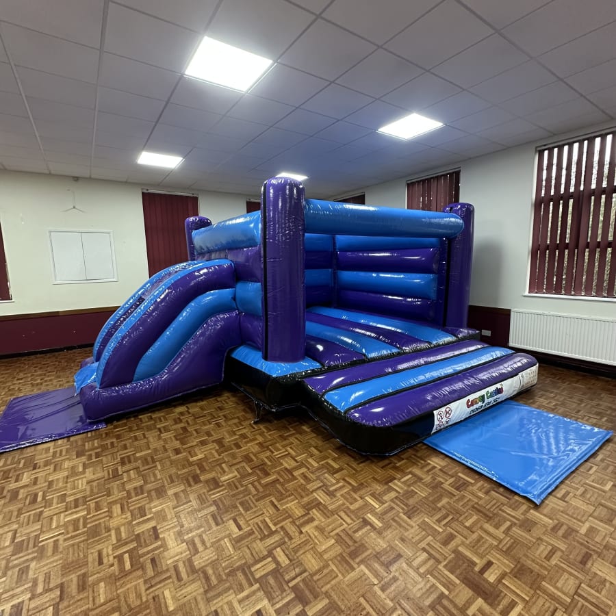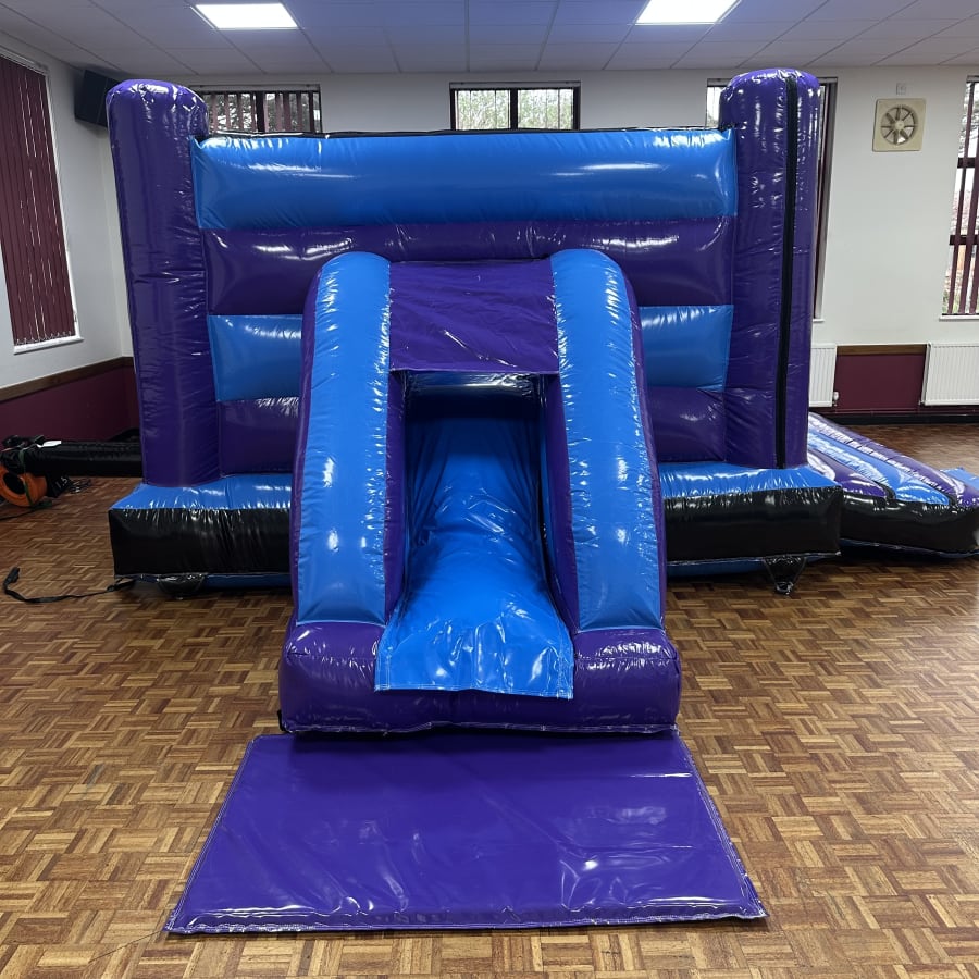 Reserve your unit fast. Our team handles delivery, set up and collection. Book party rentals essex 16ft x 17ft Blue and Purple Fortnite Design 2 Low Height Slide Combo Bouncy Castle in essex today to guarantee availability for weekends and peak season.