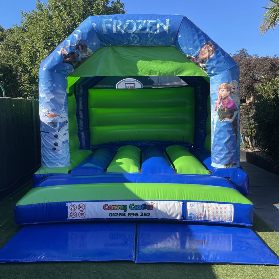 Book our 12ft x 12ft Green and Blue Frozen Bouncy Castle today and take your party to the next level!