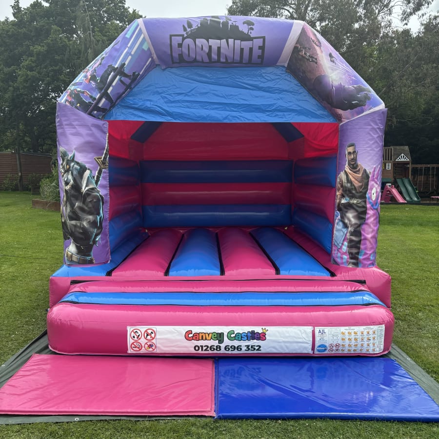 Experience hassle-free party planning with our reliable party rentals Essex 12ft x 15ft Blue and Pink Fortnite Design 2 Bouncy Castle in Essex. We are committed to delivering an exceptional service that brings fun and joy to your special day. Ensure your party is a standout success by booking this unique bouncy castle today!
