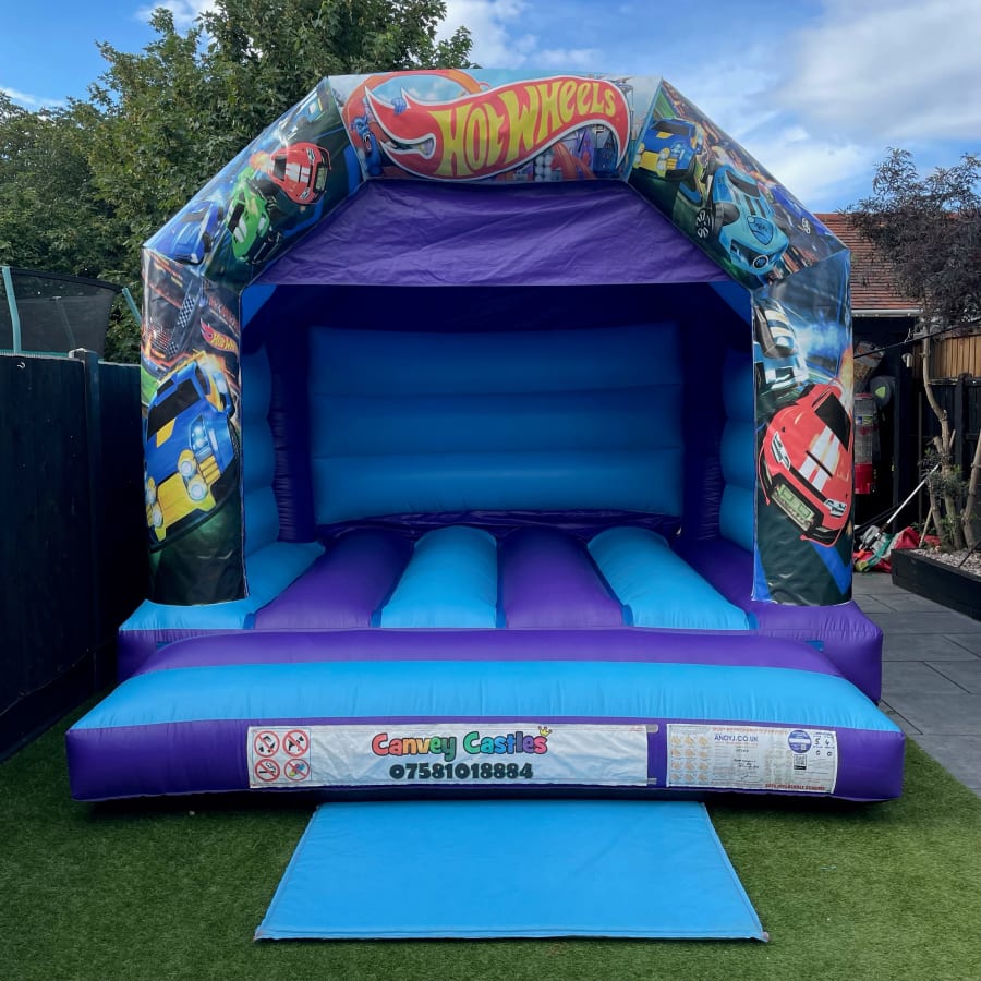 12ft x 12ft Light Blue and Purple Hot Wheels Bouncy Castle in Essex