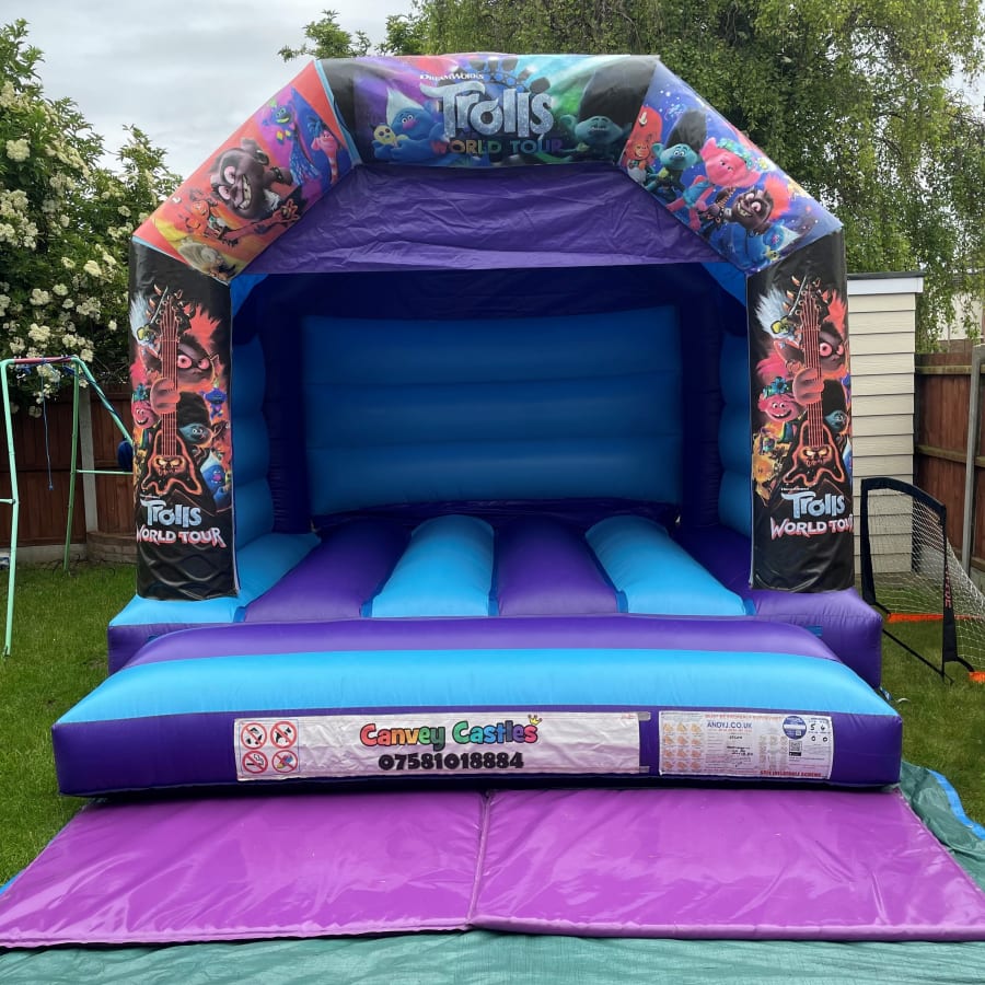 12ft x 12ft Light Blue and Purple Trolls World Tour Bouncy Castle in Essex
