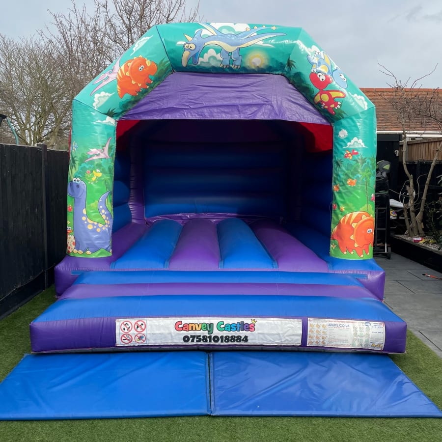 Blue and Purple Dinosaurs Castle is available to hire across Essex, including Benfleet, Basildon & Southend, as well as all areas of our county.