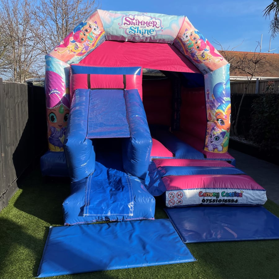 Whether you're hosting a birthday party, school event, or community fair, the 12ft x 17ft Pink And Blue Simmer and Shine Combo Bouncy Castle is a versatile entertainment option that suits various themes and venues. Its engaging design and functionality are sure to bring joy and laughter to every guest.