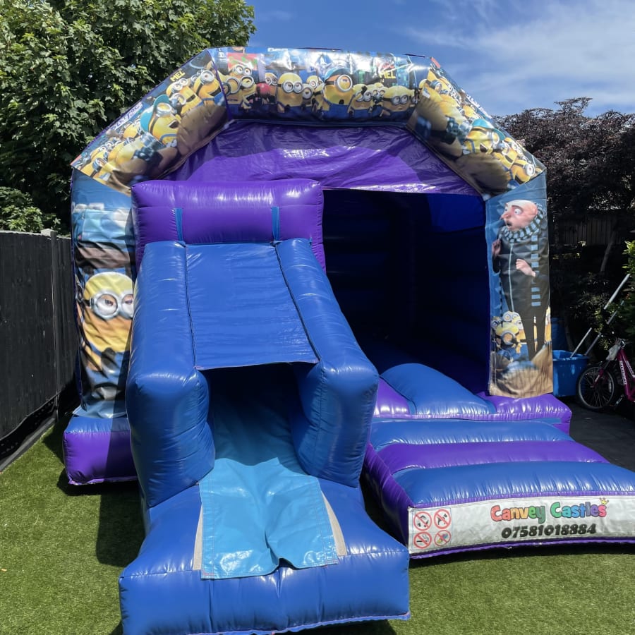 Unleash the Fun with the 12ft x 17ft Blue and Purple Minions Slide Combo Bouncy Castle