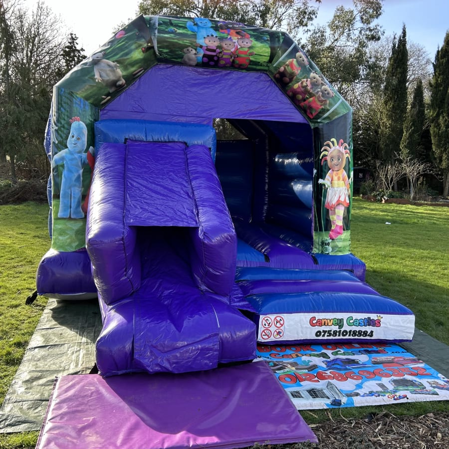 Our bouncy castle offers a unique combination of bouncing and sliding, providing double the fun for children. The vibrant blue and purple color scheme, coupled with the charming In The Night Garden theme, captivates children and immerses them in a world of wonder and play. This inflatable is not only visually appealing but also crafted with safety and durability in mind, ensuring peace of mind for parents while their little ones play.