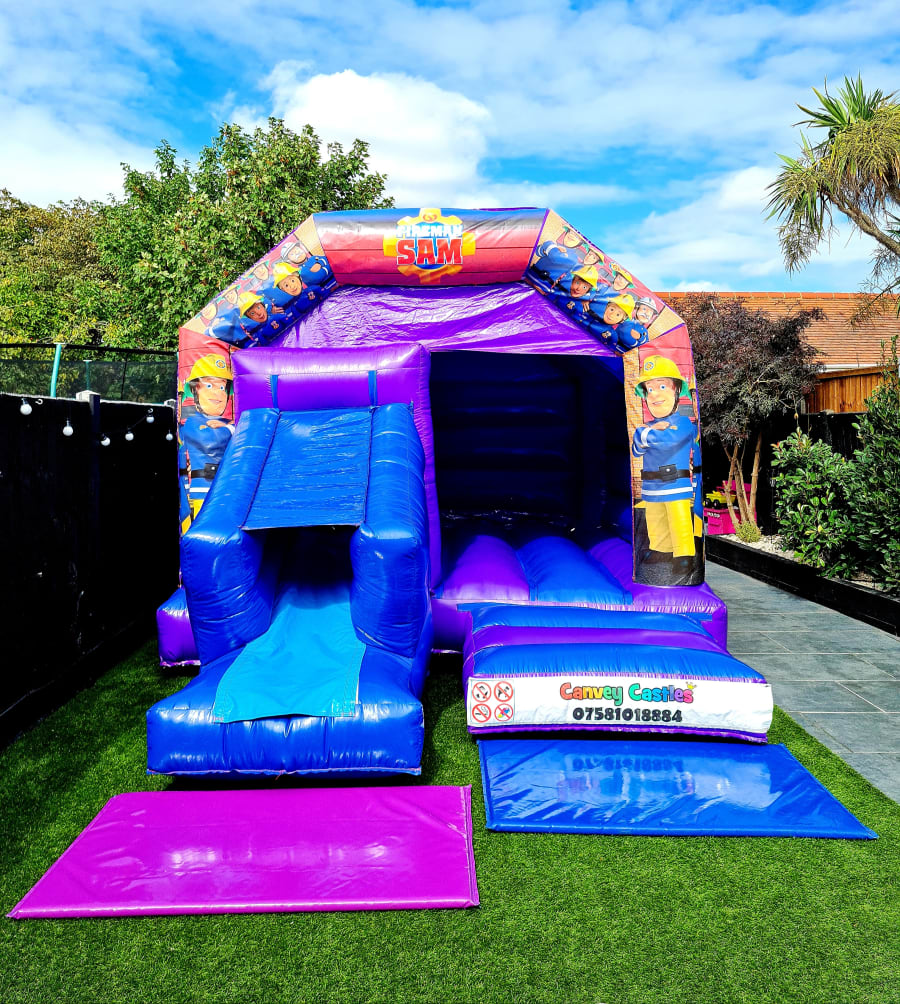 Exciting Party Fun with the 12ft x 17ft Blue and Purple Fireman Sam Slide Combo Bouncy Castle