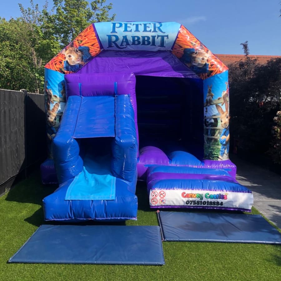 Book the 12ft x 17ft Blue and Purple Peter Rabbit Slide Combo Bouncy Castle Today!