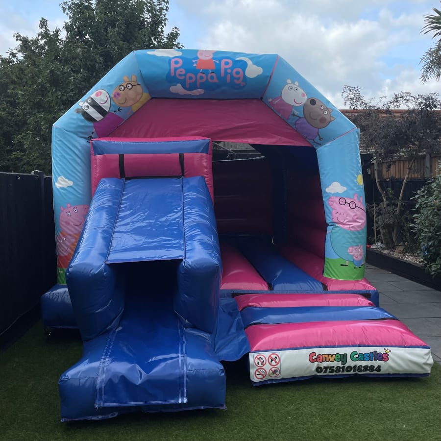 Transform any party into a vibrant and fun-filled extravaganza with the 12ft x 17ft Pink and Blue Peppa Pig Design 2 Slide Combo Bouncy Castle. Perfect for children who adore Peppa Pig, this bouncy castle will provide hours of exhilarating entertainment. The stunning pink and blue design captures the essence of Peppa Pig, making it an instant hit at any gathering. Whether it's a birthday party, school event, or community fair, this bouncy castle is guaranteed to be the center of attraction.