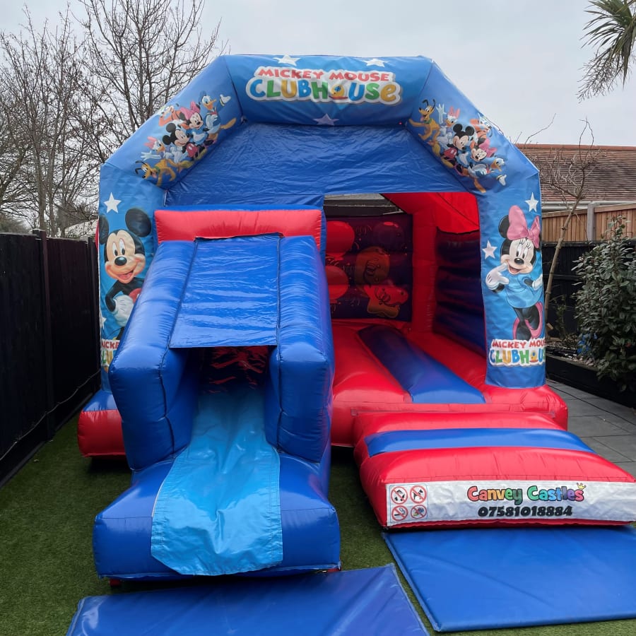 Bring the magic of Mickey Mouse to your next event and watch as children's faces light up with joy. Contact us today to reserve the 12ft x 17ft Blue and Red Mickey Mouse ClubHouse Slide Combo Bouncy Castle, and let us help make your celebration a memorable success.