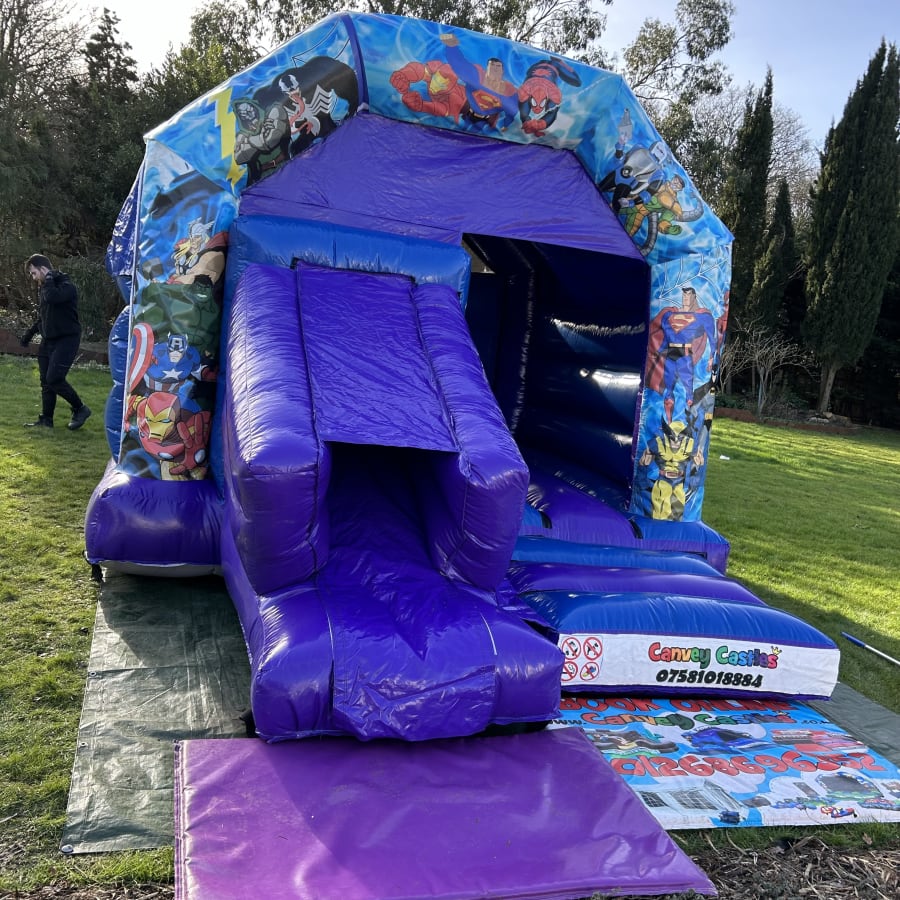 Experience the Ultimate Adventure with Our 12ft x 17ft Blue and Purple Avengers Slide Combo Bouncy Castle