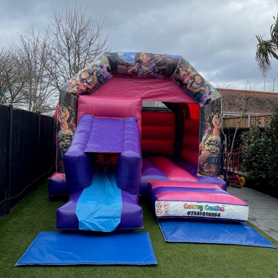 Unleash the Magic with the 12ft x 17ft Pink and Purple Encanto Slide Combo Bouncy Castle
