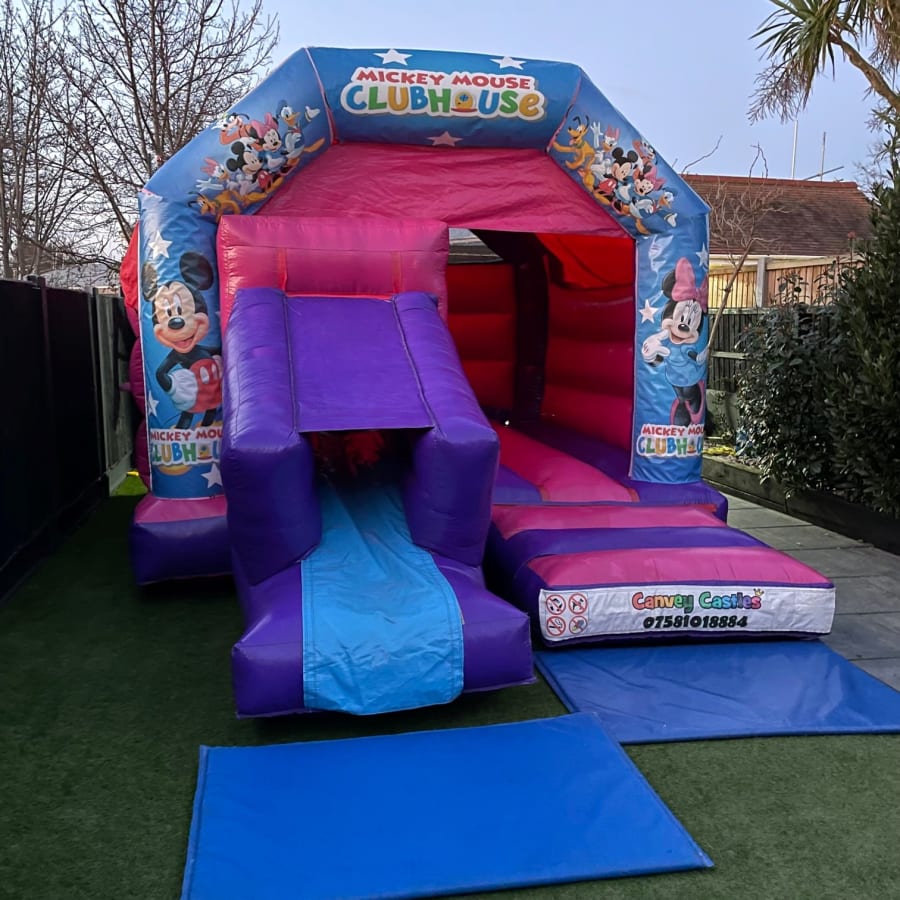 Looking to add a splash of magic to your next event? Our 12ft x 17ft Pink and Purple Mickey Mouse Clubhouse Slide Combo Bouncy Castle is the perfect centerpiece for any children's party. Designed with vibrant pink and purple hues, and featuring beloved characters from the Mickey Mouse Clubhouse, this bouncy castle promises hours of fun and excitement for your little ones.