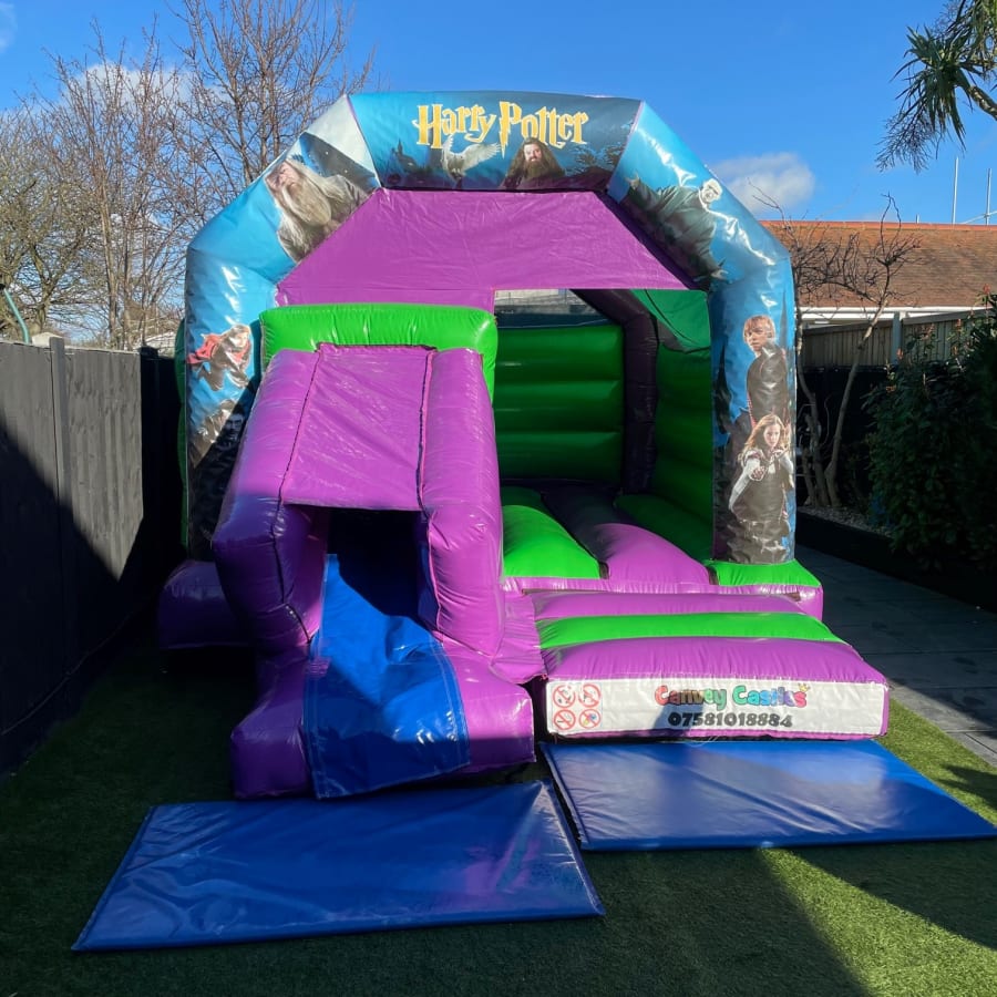 Magical Adventures Await with the 12ft x 17ft Green and Purple Harry Potter Slide Combo Bouncy Castle
