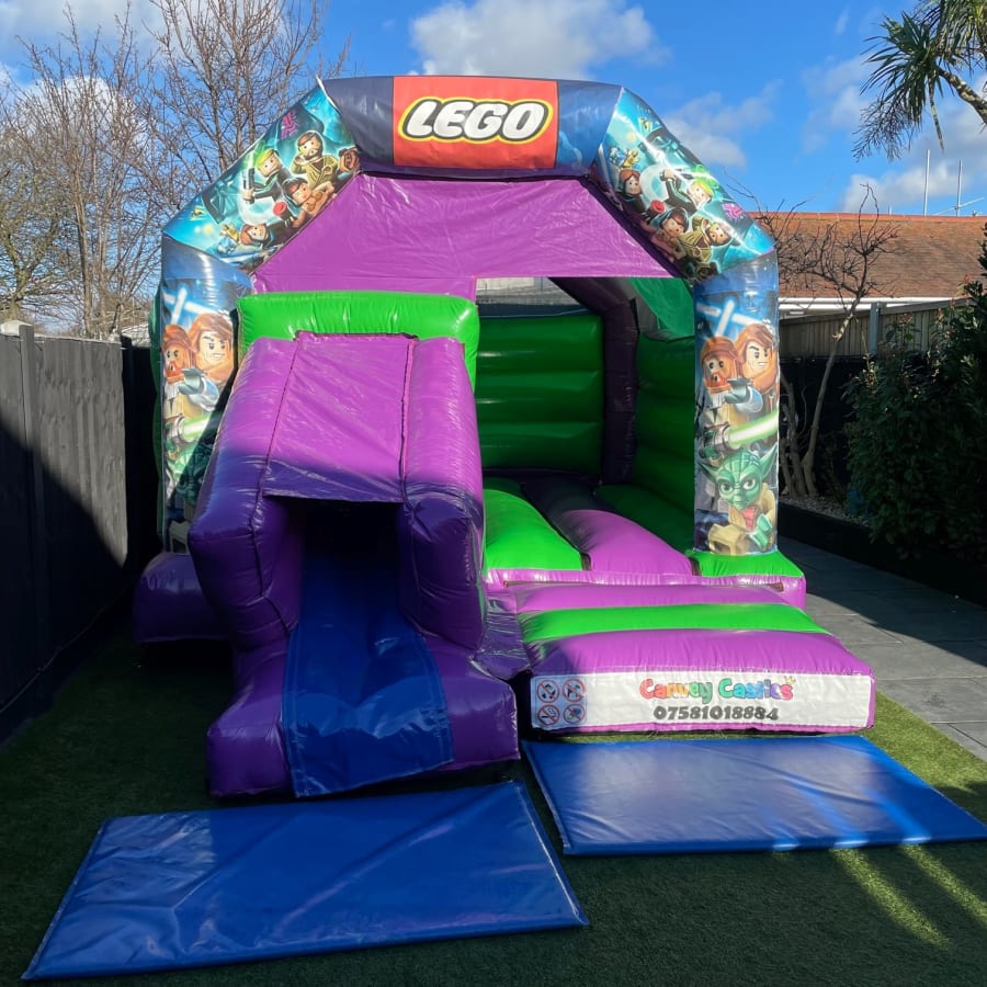 Planning an event in Essex? Look no further than Canvey Castles for your party entertainment needs. Our canvey castles 12ft x 17ft Green and Purple Lego Star Wars Slide Combo Bouncy Castle in Essex is available for hire across the region. Whether you're hosting a birthday party, community fair, or school event, this bouncy castle promises to be a hit among the young crowd, providing a safe and entertaining environment for children to enjoy.