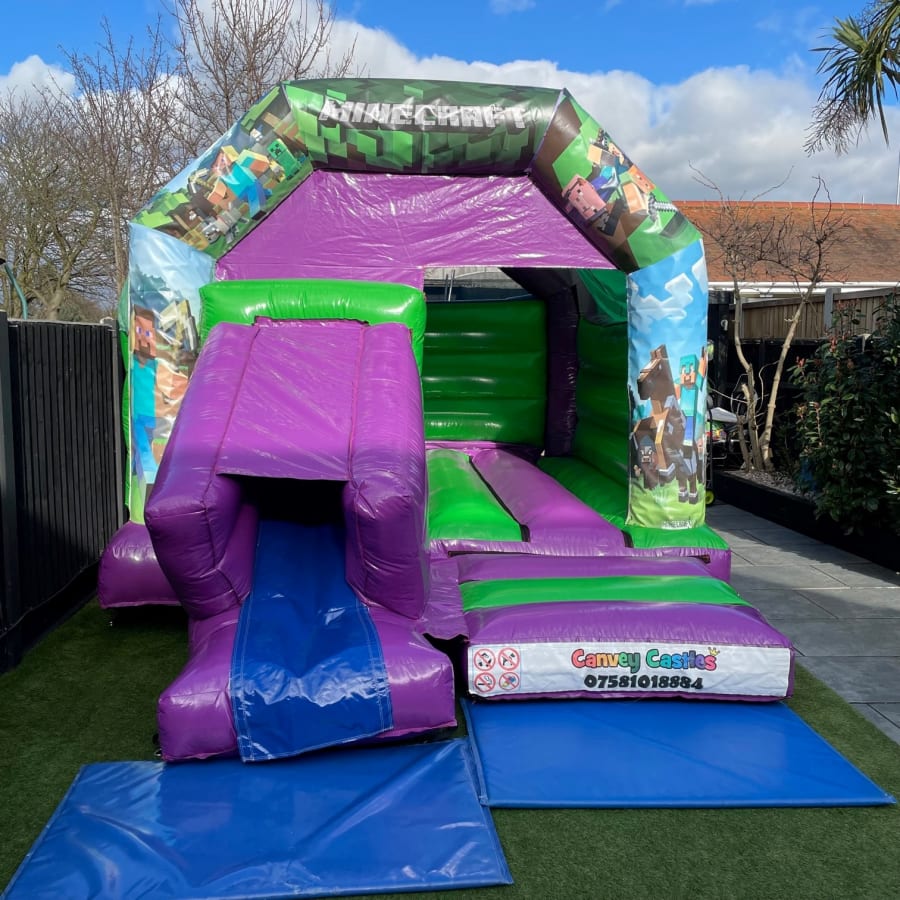 Ready to take your event to the next level? Contact us today to book the 12ft x 17ft Green and Purple Minecraft Slide Combo Bouncy Castle in Essex. Let us help you create an unforgettable event filled with laughter, joy, and the spirit of adventure. Reserve your date now and make your event a block-busting success!