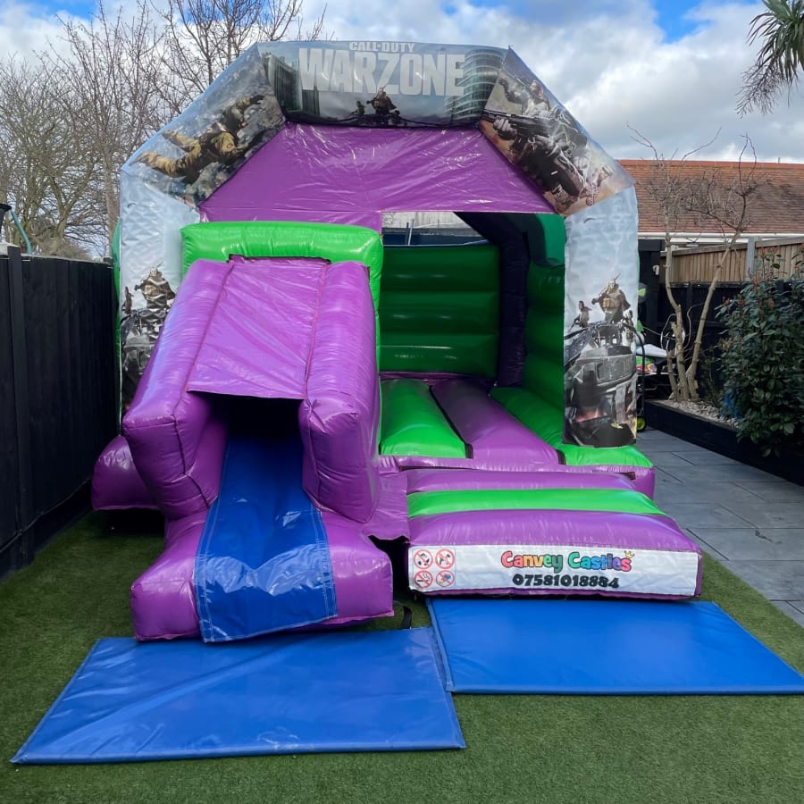 Transform any event into an adrenaline-packed adventure with our 12ft x 17ft Green and Purple Call Of Duty Warzone Slide Combo Bouncy Castle. Perfect for parties, community events, or family gatherings, this bouncy castle is designed to capture the thrill of your favorite action-packed game. A true crowd-pleaser, it promises hours of entertainment for kids and adults alike.