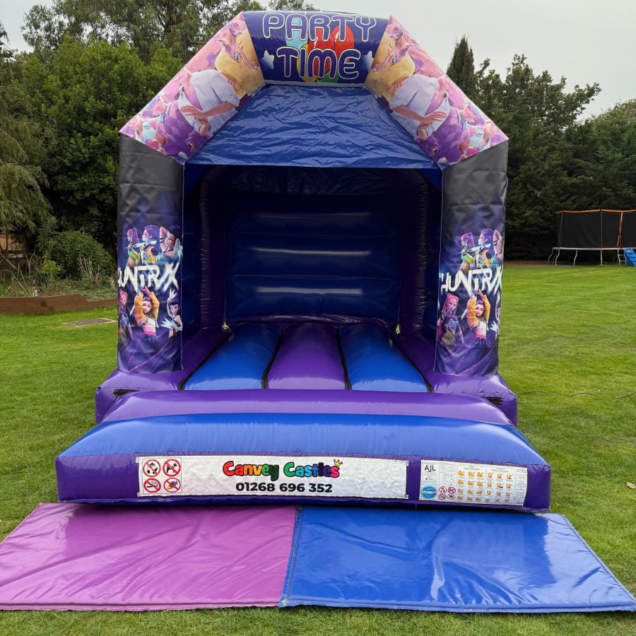 Book party rentals essex 10ft x 12ft Blue and Purple K-Pop Demon Hunters Bouncy Castle for birthday parties, fetes, corporate family days, and themed events in essex. The castle creates a memorable focal point. Children love the colourful graphics. Hosts get a reliable, safe attraction that fits most outdoor and indoor spaces.