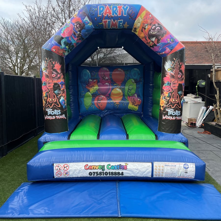 Get Ready for an Epic Celebration with the 10ft x 12ft Green and Blue Trolls World Tour Bouncy Castle in Essex, Chelmsford, Southend, and Brentwood