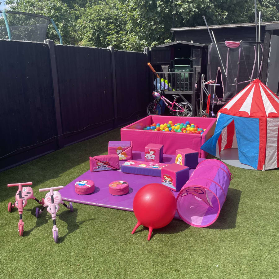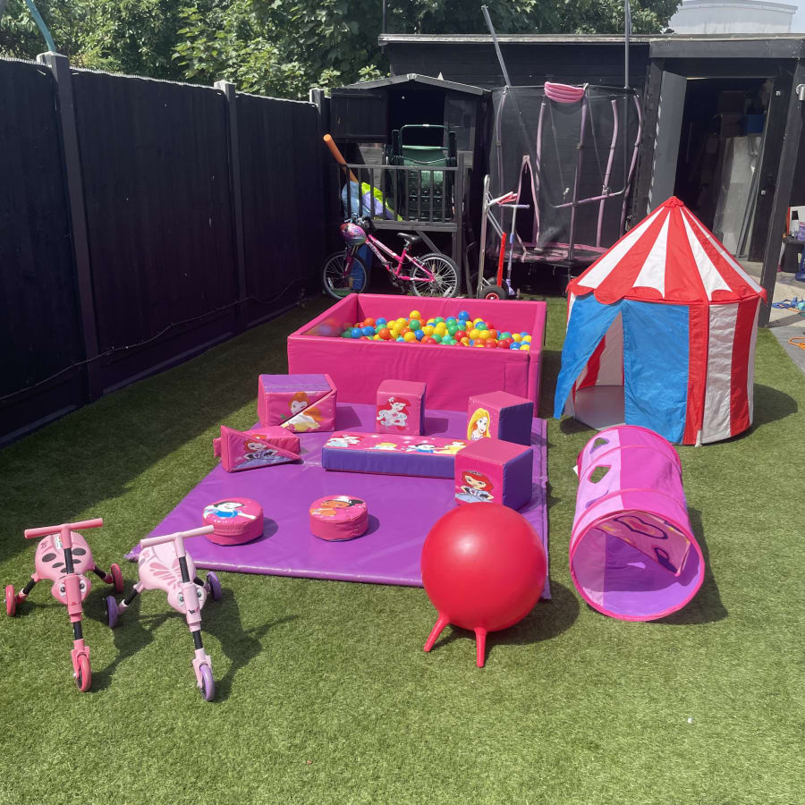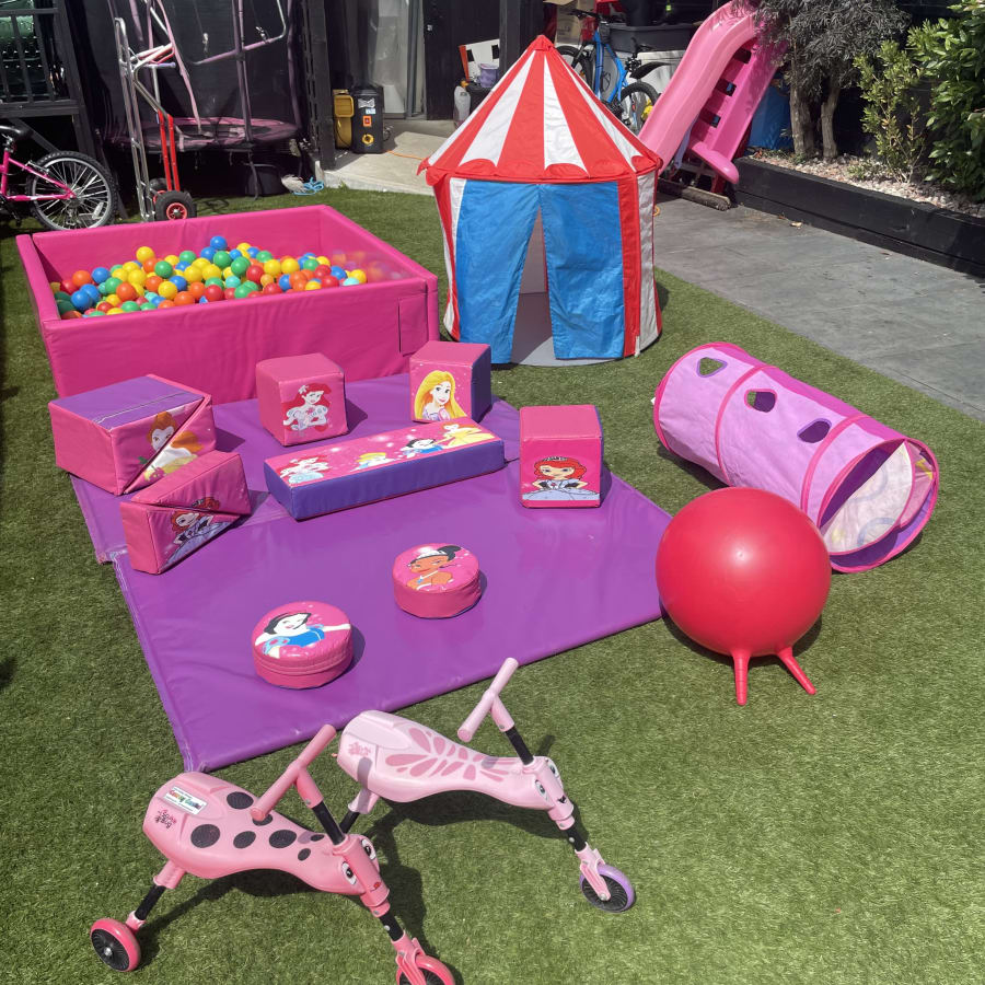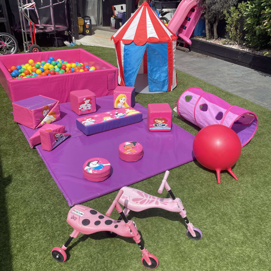Disney Princess themed soft play package in pink and purple, the perfect party package for your little princess. Including in this exciting bundle is 10 assorted disney printed princess shapes, tunnel, 2 trikes, tent, pink ball pit, space hopper and matting as standard.