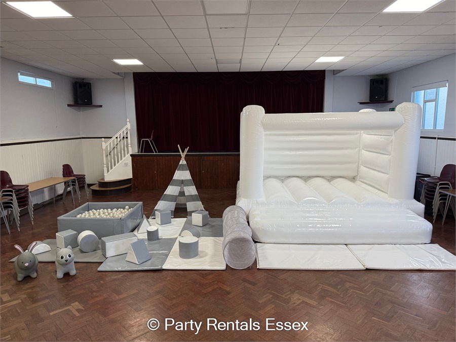 party rentals essex White Pastel Party Package 1 in essex delivers a clean, stylish setup for birthdays, baby showers, and intimate events. This package pairs a 12ft x 12ft white low-height bouncy castle with a matching white and grey soft play area. It’s designed for safety, easy supervision, and a polished look that fits modern party themes across essex.